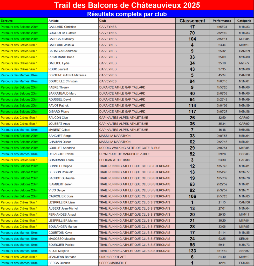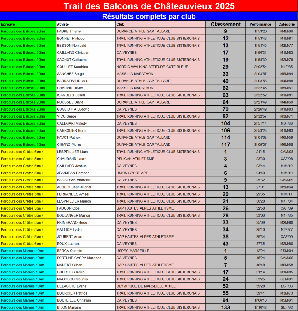 Sur le 20km, le premier licencié prendra la 9ème place. Il s’agit de Thierry FABRE (Durance Athlé Gap Tallard) avec un temps affiché de 1h53min20.